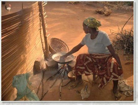 Häusern brennt ein Kochfeuer aus kleinen Stöcken, über dem in einem Topf vielleicht Kohl,